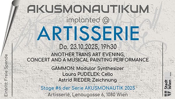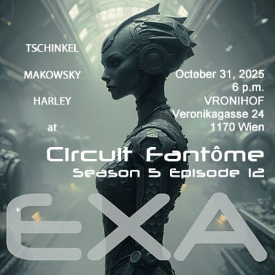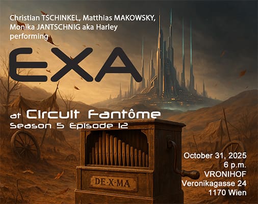 • Neues Werk: EXA / 40:44min / Erstaufführung im Rahmen der Circuit Fantôme-Reihe 2025 am 31.10.2025 im Vronihof Wien (Veronikagasse 24, 1170 Wien) / mehr Info und Soundbeispiele
